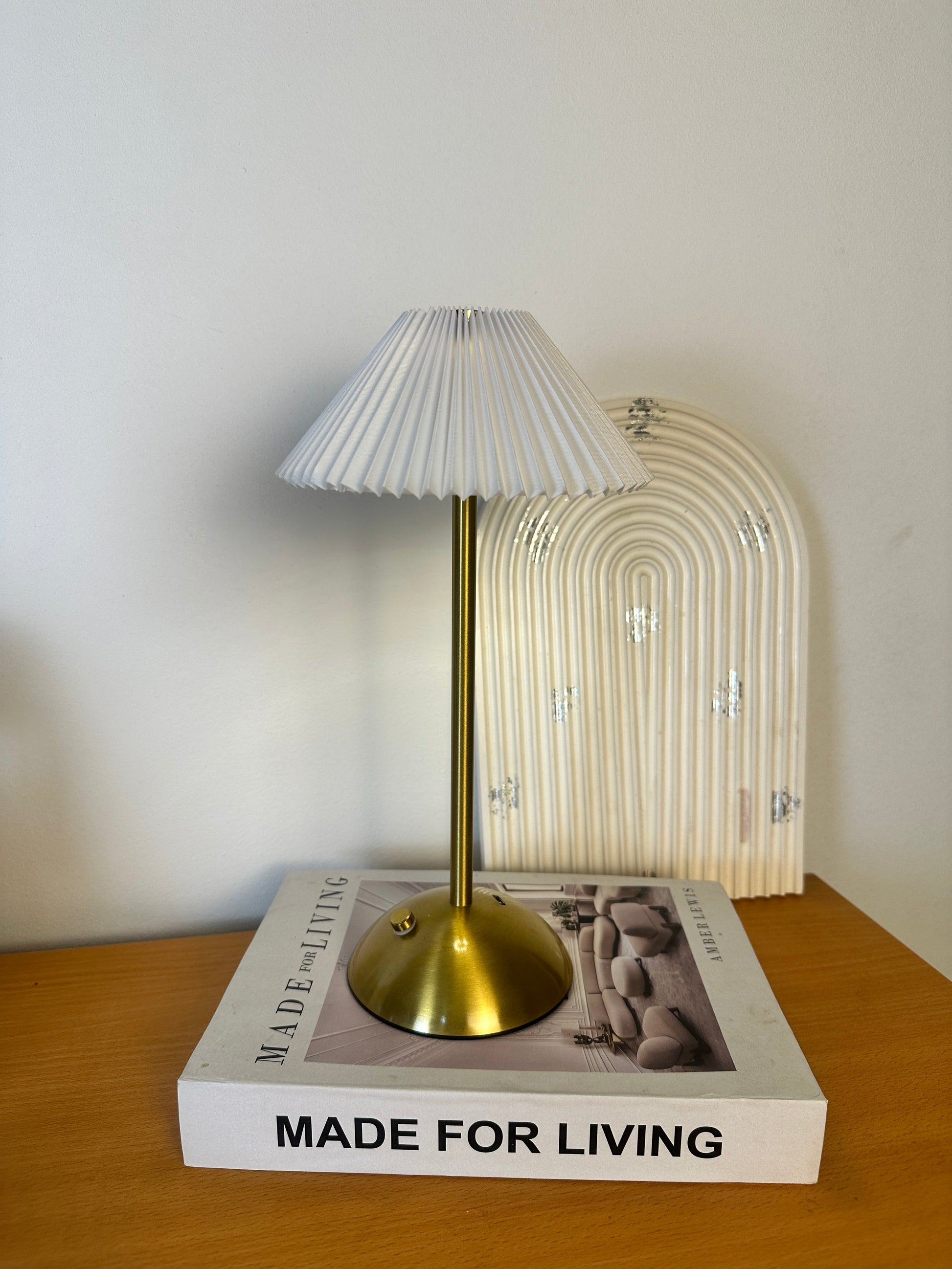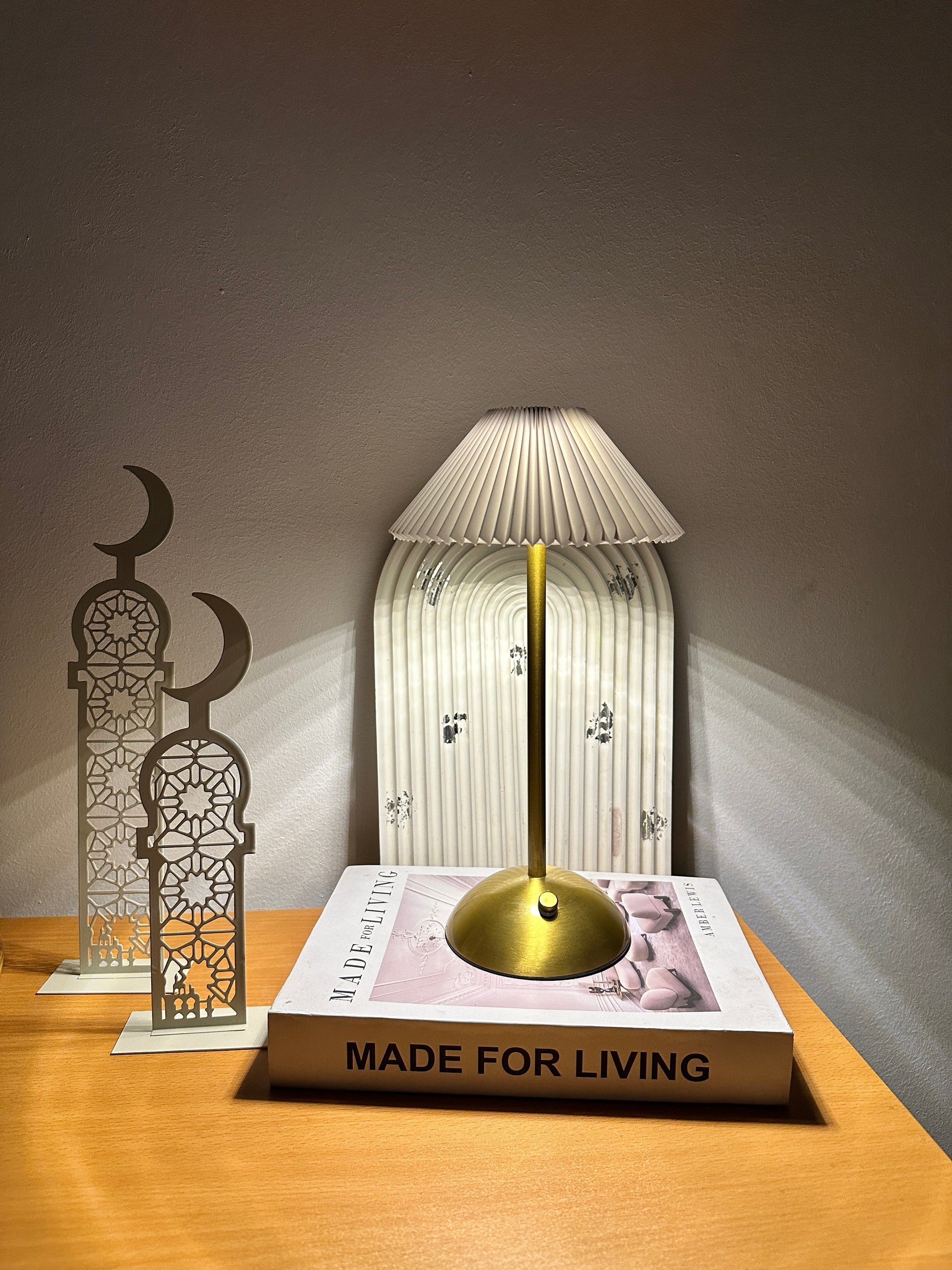 أضف لمسة من الأناقة الفرنسية إلى غرفتك مع هذا المصباح الفريد. يتميز بتصميمه الانسيابي الذي يدمج بين المعدن الذهبي المصقول والشكل "المكسّر" الأيقوني للغطاء، مما يجعله ليس مجرد وسيلة إضاءة، بل قطعة فنية تزين التربيزة أو المكتب.او بجانب السرير
