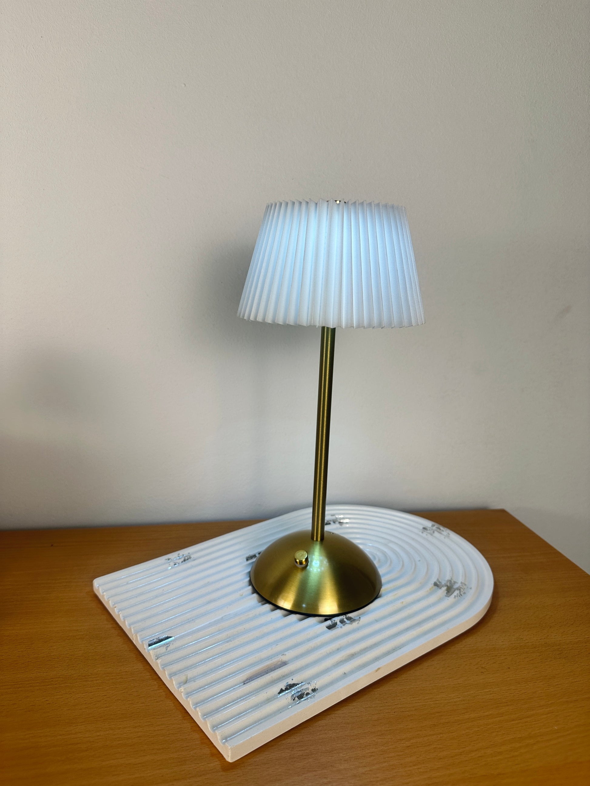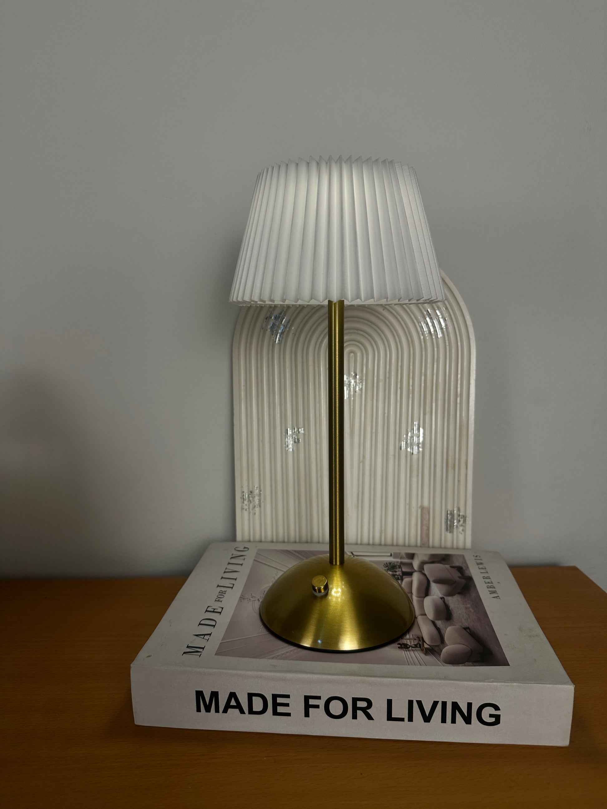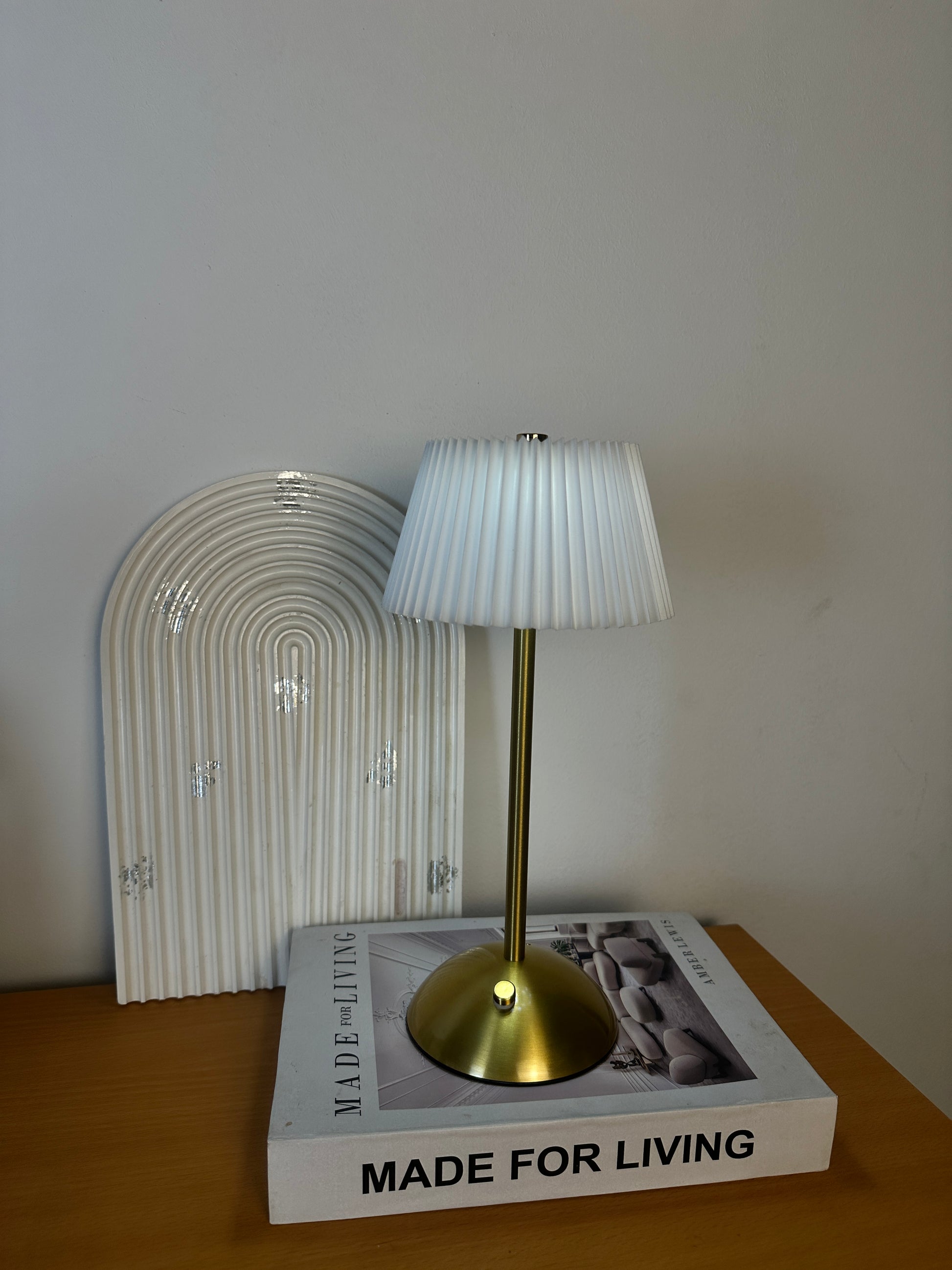أضف لمسة من الأناقة الفرنسية إلى غرفتك مع هذا المصباح الفريد. يتميز بتصميمه الانسيابي الذي يدمج بين المعدن الذهبي المصقول والشكل "المكسّر" الأيقوني للغطاء، مما يجعله ليس مجرد وسيلة إضاءة، بل قطعة فنية تزين التربيزة أو المكتب.او بجانب السرير