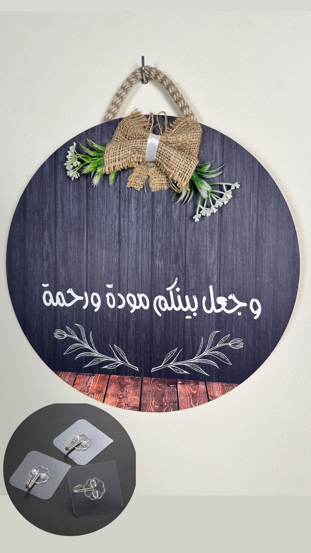 لوحة ديكور دائرية مستوحاة من الطابع الريفي، تحمل آية "وَجَعَلَ بَيْنَكُم مَّوَدَّةً وَرَحْمَةً" بخط عربي أنيق. مثالية كهدية زواج أو كقطعة فنية مميزة تعلق على مدخل المنزل أو في غرفة المعيشة وغرفة النوم.