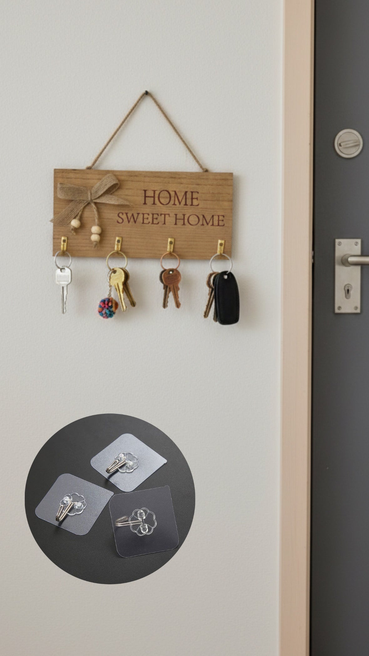 • خطاطيف المفاتيح: توجد ثلاثة خطاطيف معدنية (مفردة) باللون الذهبي اللامع مثبتة في الجزء السفلي من اللوح لتعليق المفاتيح.