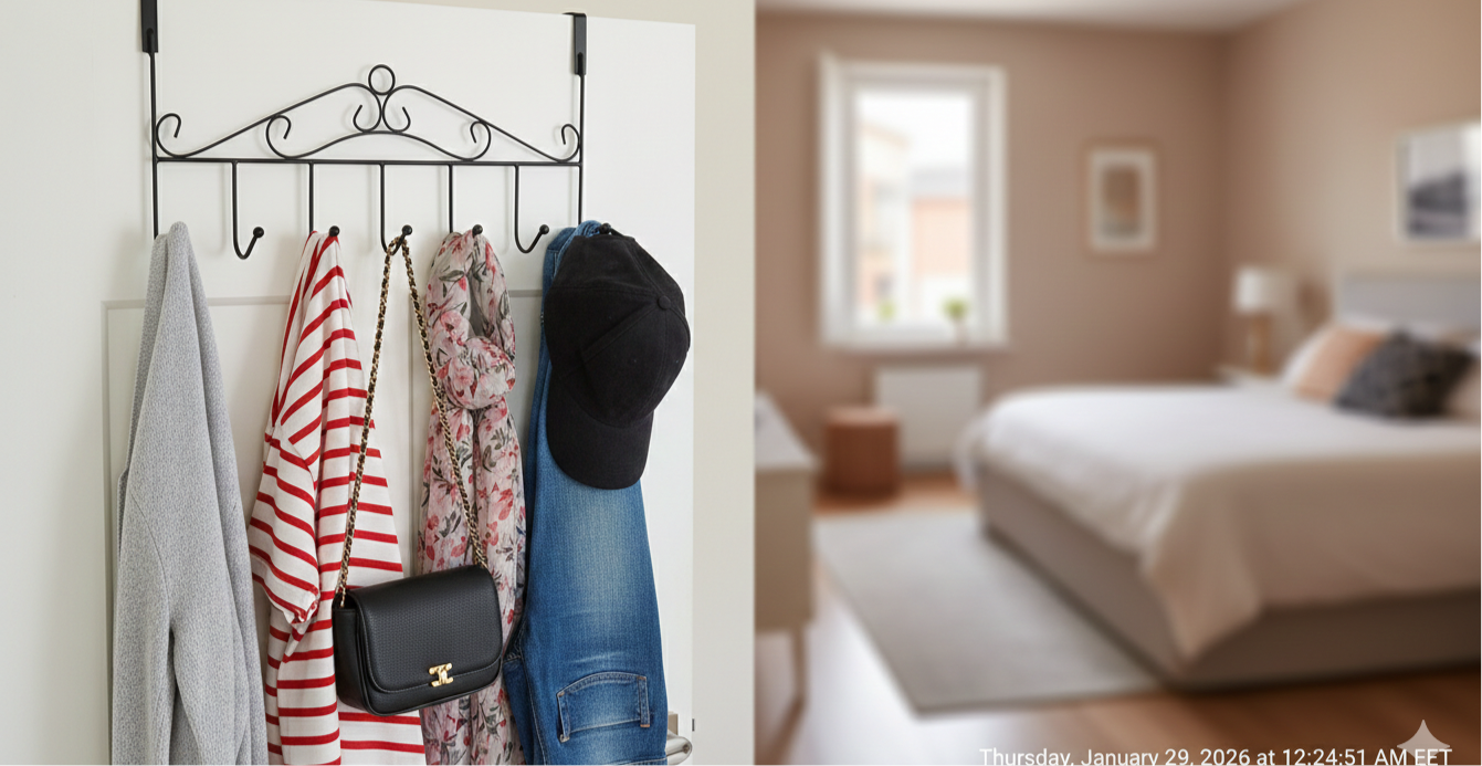 شماعة معدنية مع 6 خطافات( قطعتين مع بعض ) - سهلة التركيب بدون مسامير تتميز هذه الشماعات المعدنية المثالية بتصميم متين وقوي، مما يسمح لك بتعليق الملابس أو الحقائب أو الملحقات على باب غرفتك أو داخل خزانة الملابس بسهولة - لا حاجة إلى المسامير أو أدوات الحفر.