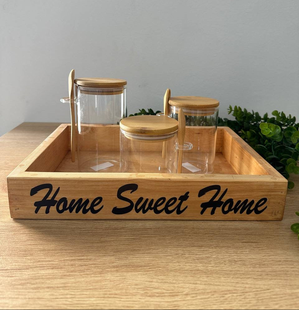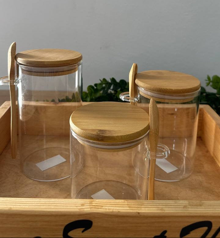 طقم برطمانات 3 قطع احجام مختلفة زجاج بغطاء خشب محكم الغلق مزود بمعالق خشب للشاى والقهوة والسكر او التوابل
