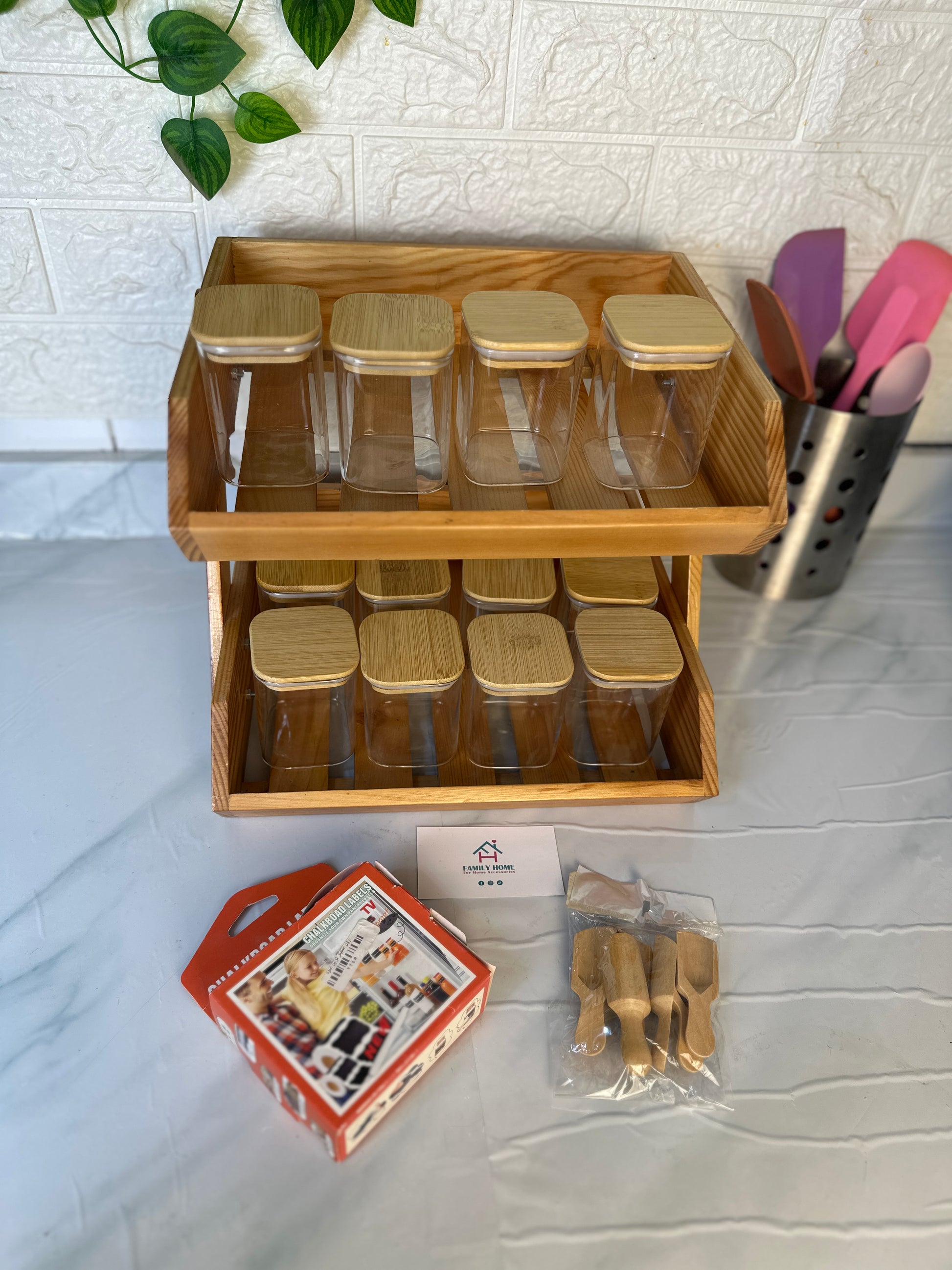 استاند خشب دورين و طقم 12 برطمان زجاج بغطاء خشب