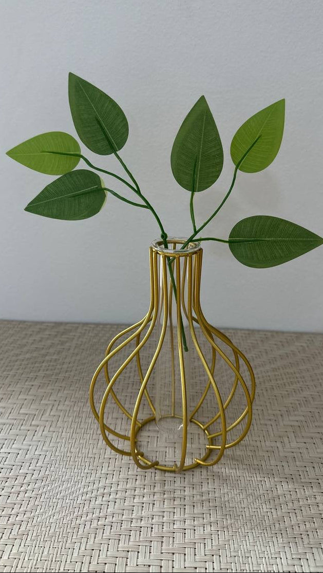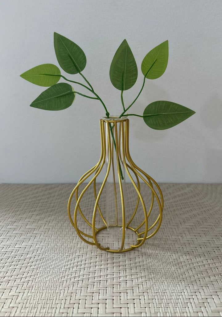 مزهرية ديكور فاخرة بتصميم شبكي ذهبي أنيق يحيط بأنبوب زجاجي شفاف. قطعة فنية عصرية تضفي لمسة برّاقة (Glam) على أي زاوية في المنزل، مثالية لعرض الأزهار المفردة أو سيقان النباتات البسيطة.