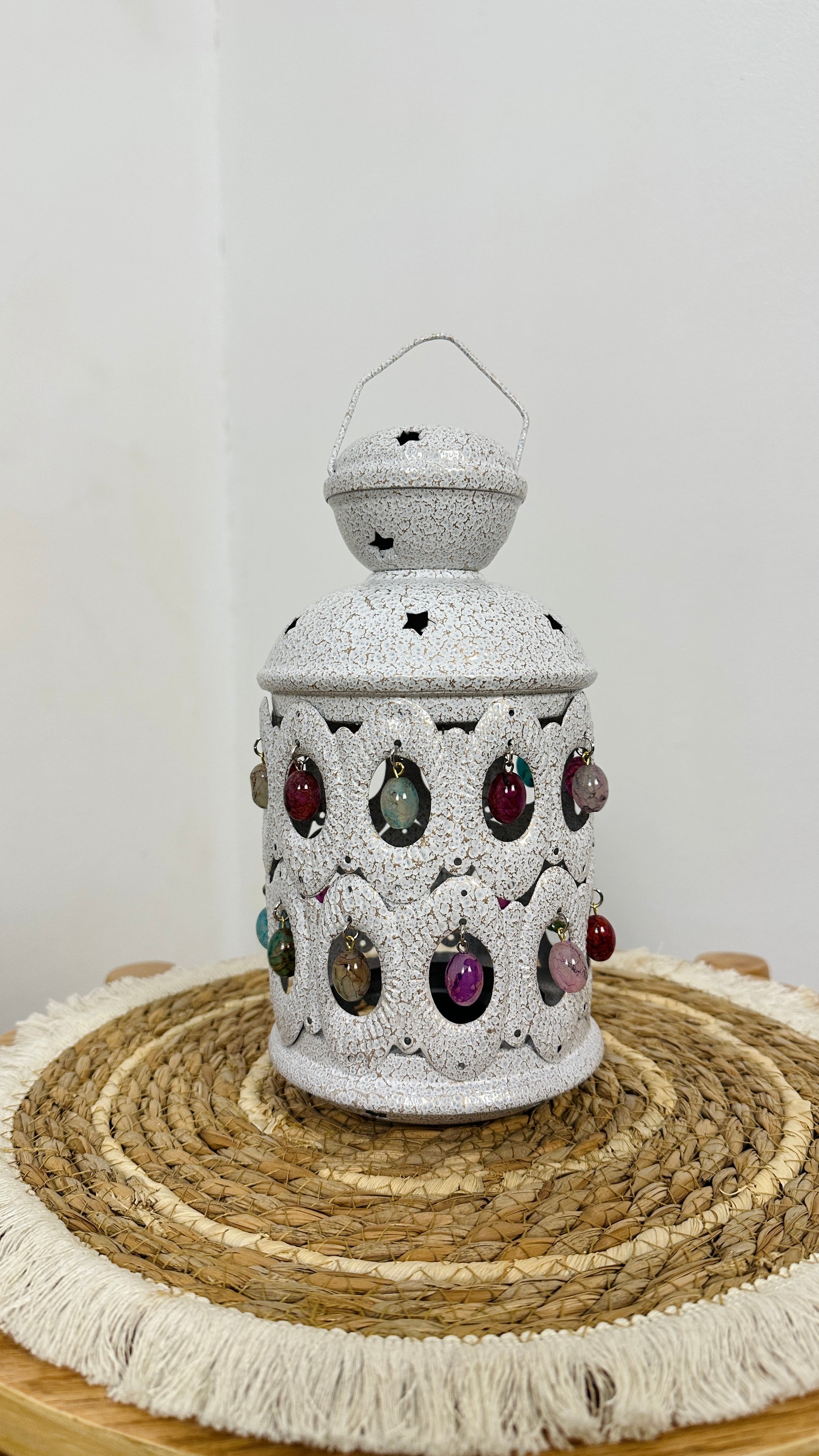 فانوس معدن بدلايات خرز لون ابيض حجم كبير