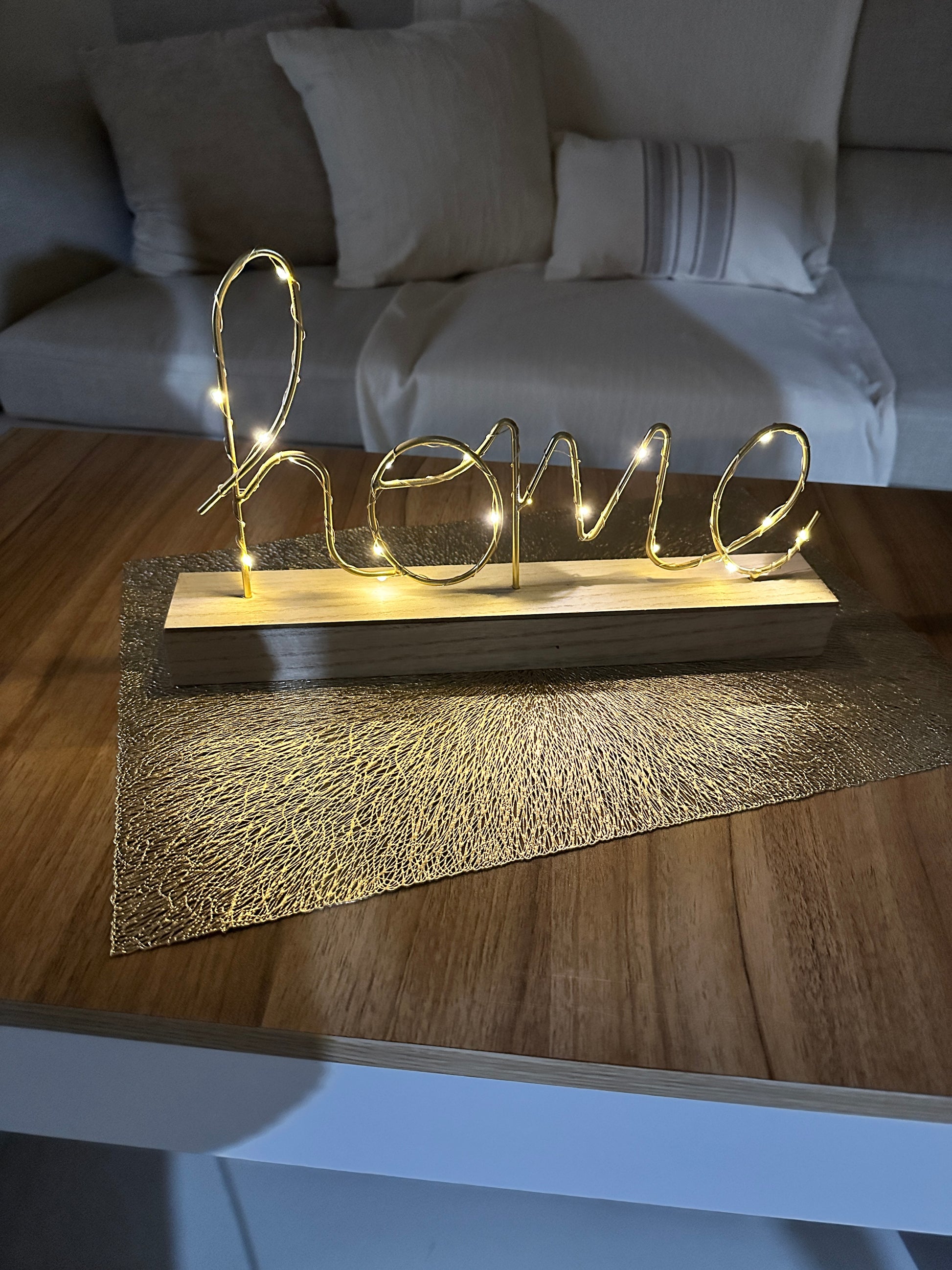 تصميم يجمع بين الطبيعة والإضاءة: تتكون من كلمة "HOME" المصنوعة من أسلاك ذهبية رقيقة مضاءة بأضواء LED صغيرة، مثبتة بأناقة على قاعدة خشبية متينة بلون خشبي طبيعي دافئ.
