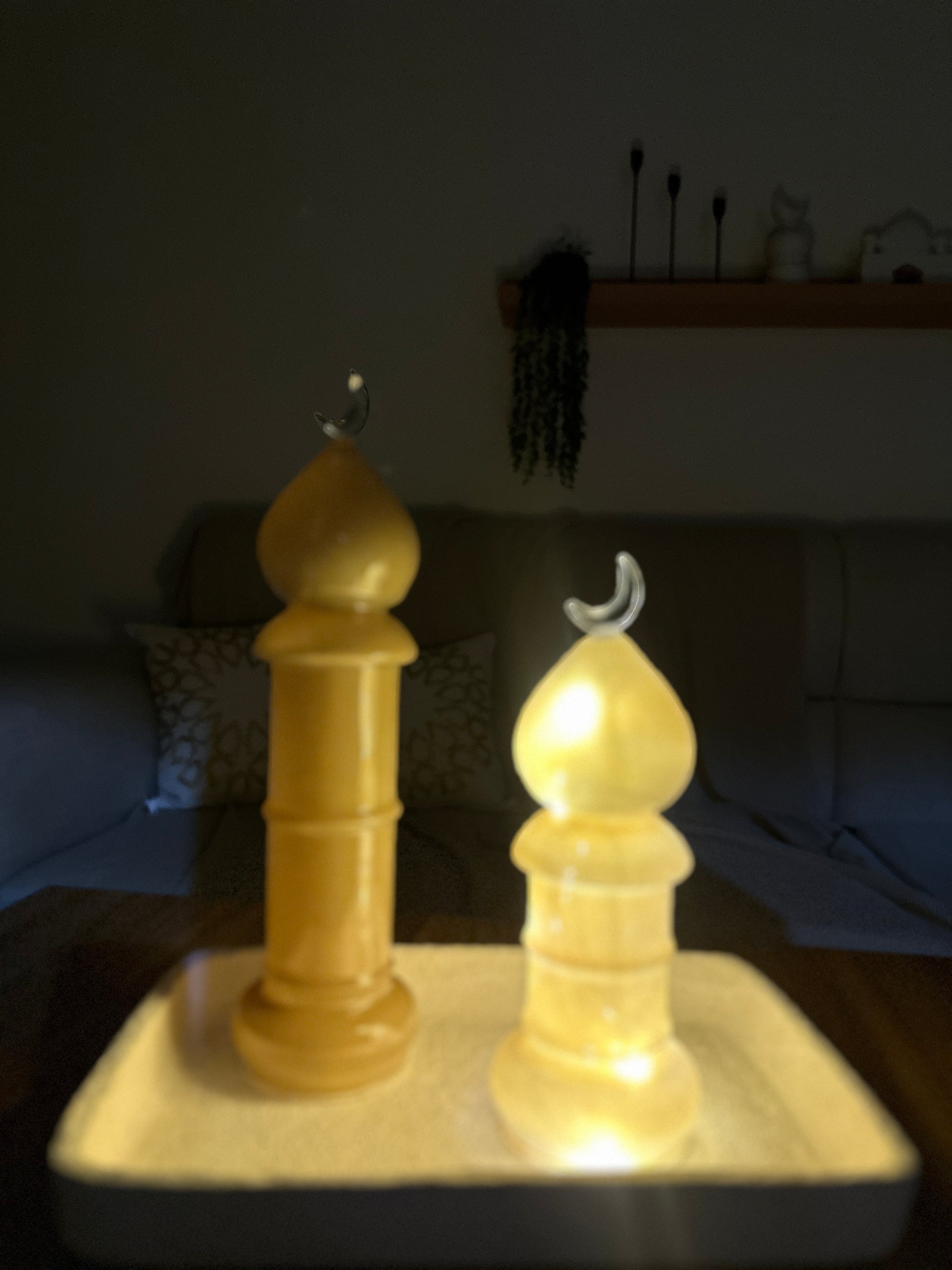 أضيفي لمسة من الطمأنينة إلى ركنك المفضل مع هذه القطعة الفنية المستوحاة من العمارة الإسلامية العريقة. تصميم زجاجي انسيابي يجمع بين بساطة المودرن وروحانية التراث، يعلوه هلال رقيق يضيء عتمة المكان بنور خافت ودافئ.