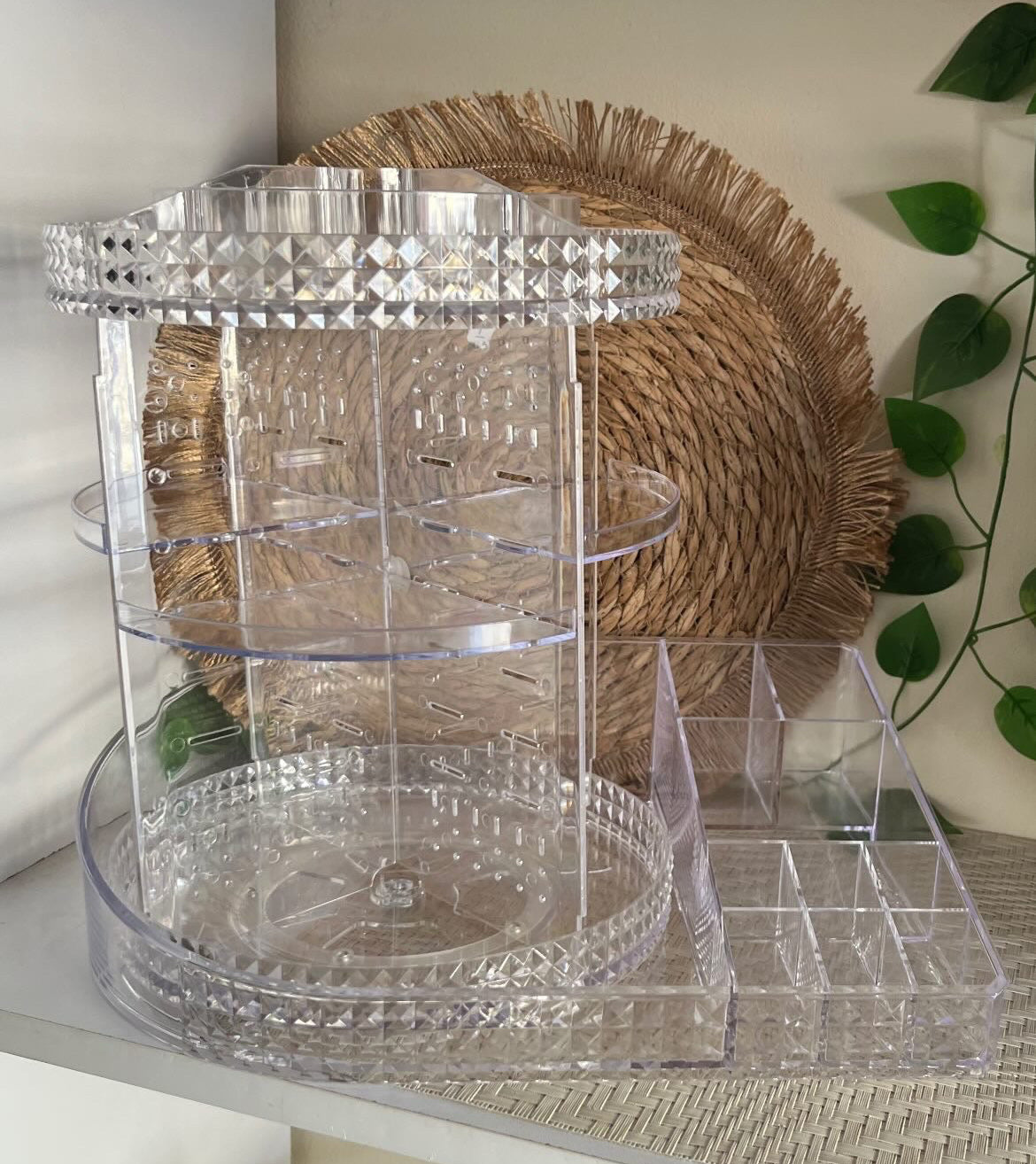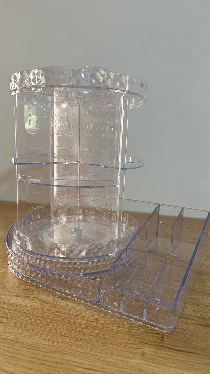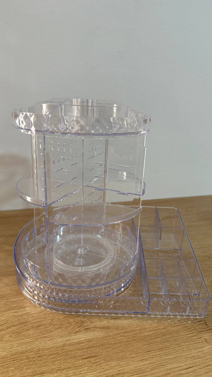 ودعي الفوضى ورحبي بالأناقة والتنظيم مع منظم المكياج الدوار 360 درجة! يتميز هذا المنظم الشفاف بتصميمه الاكريليك الذي يضيف لمسة من الرقي إلى التسريحة أو الحمام. إنه الحل الأمثل لتجميع كل مستحضرات التجميل والعطور ومنتجات العناية بالبشرة في مكان واحد، مع إمكانية الوصول إليها بسهولة تامة.