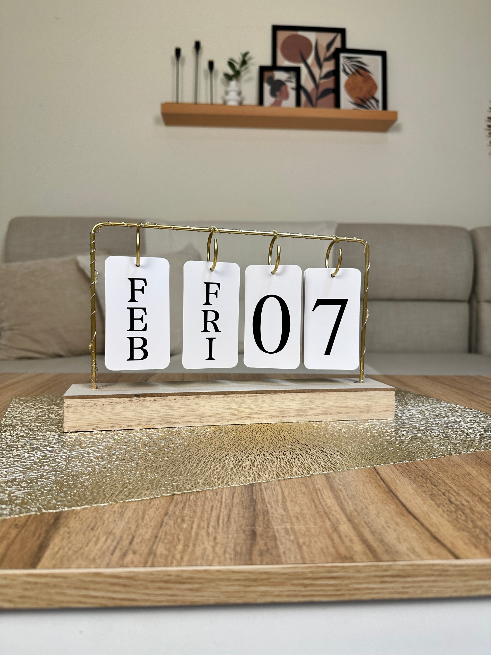 تقويم مكتبي دائم وأنيق يجمع بين القاعدة الخشبية الدافئة والإطار المعدني الذهبي العصري. يتميز ببطاقات معلقة قابلة للقلب لتغيير التاريخ واليوم والشهر، ليصبح قطعة ديكور عملية لا تنتهي صلاحيتها.