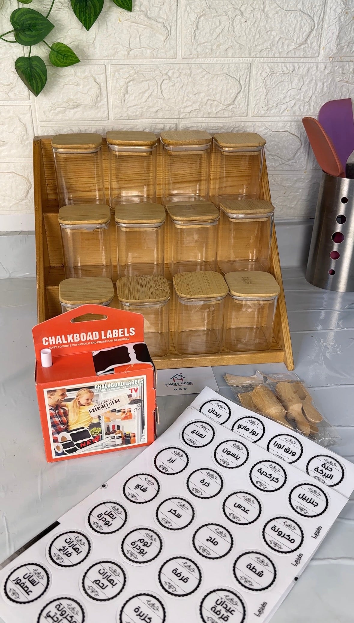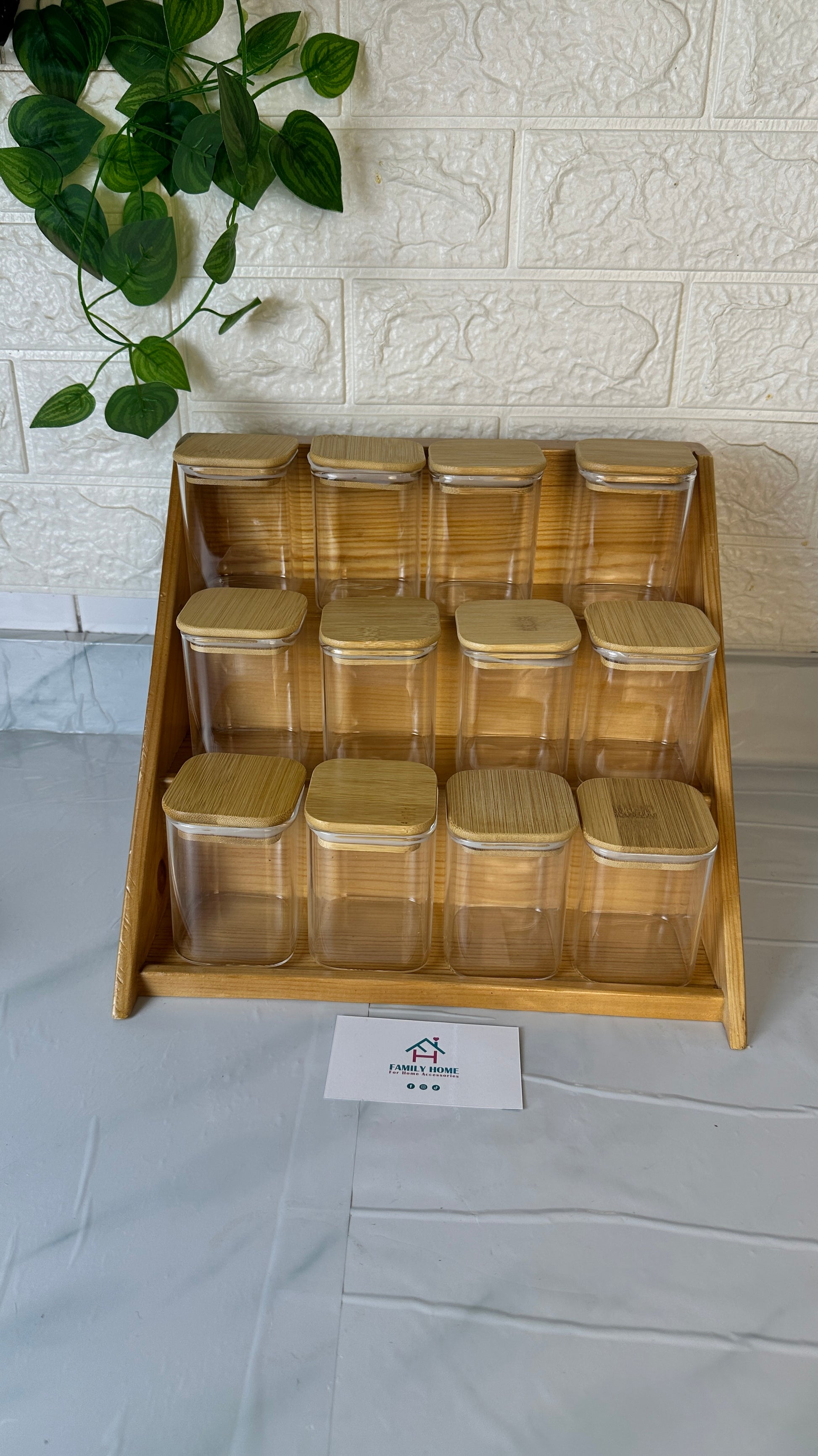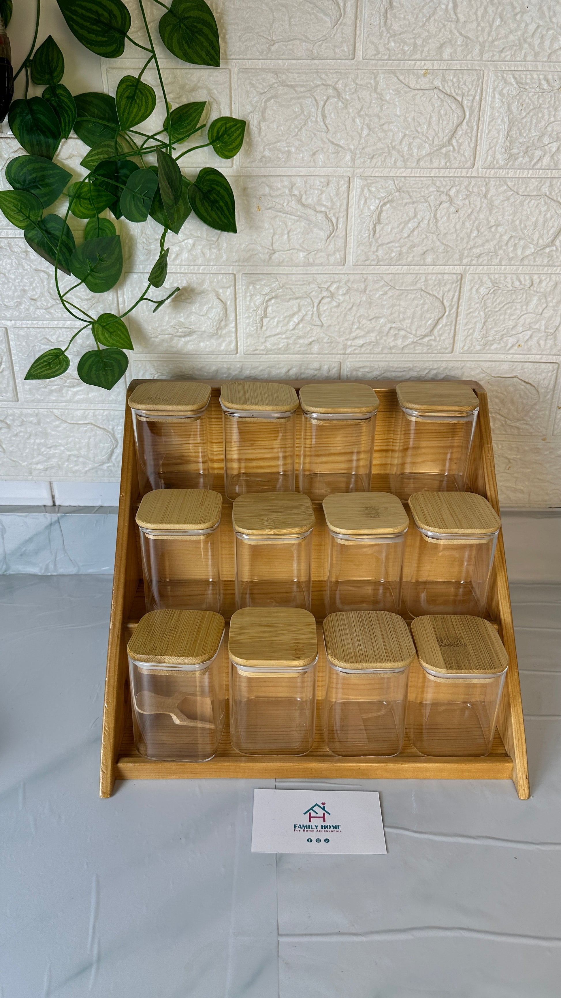 استاند سلم خشب و طقم 12 برطمان زجاج بغطاء خشب