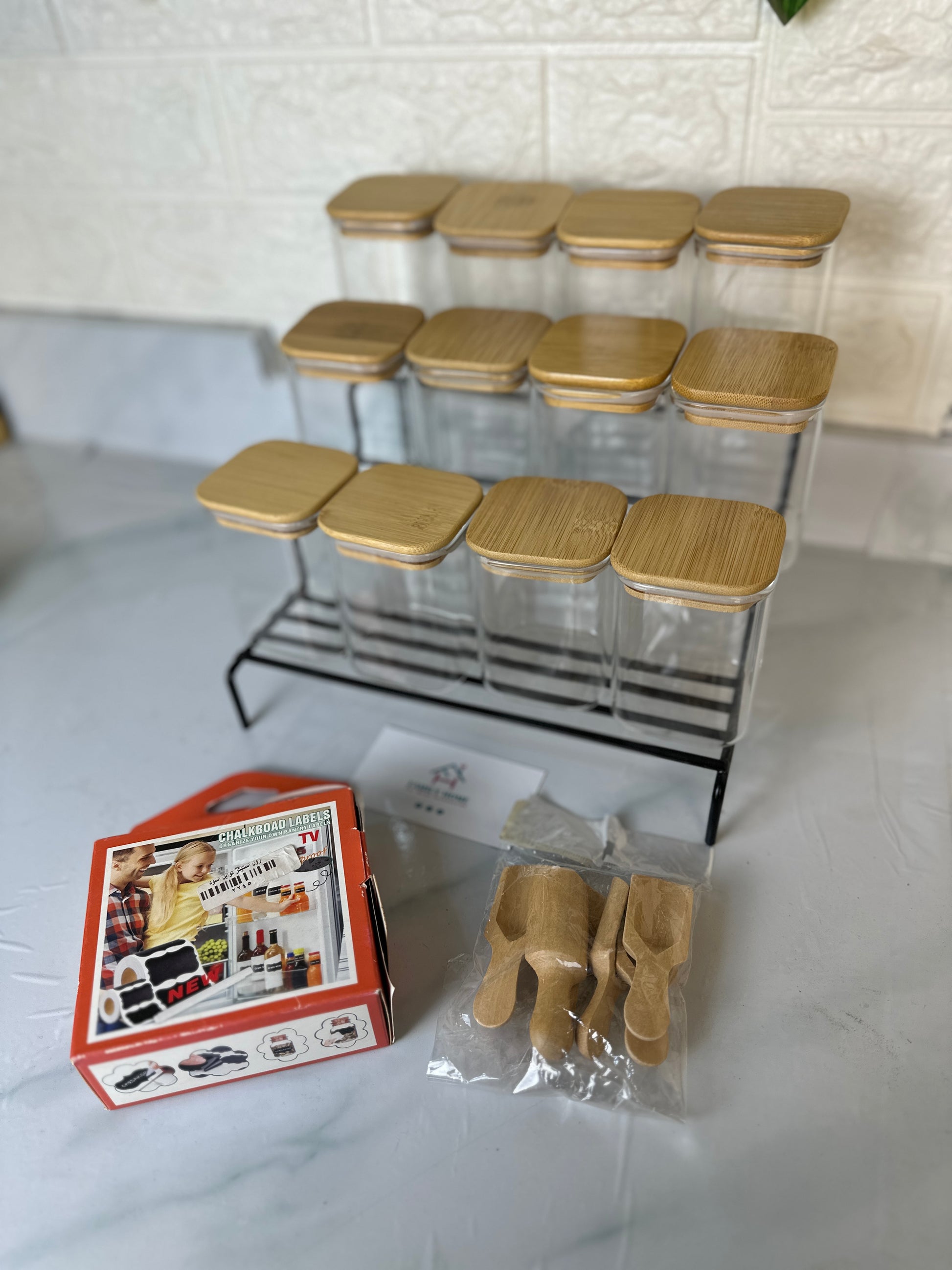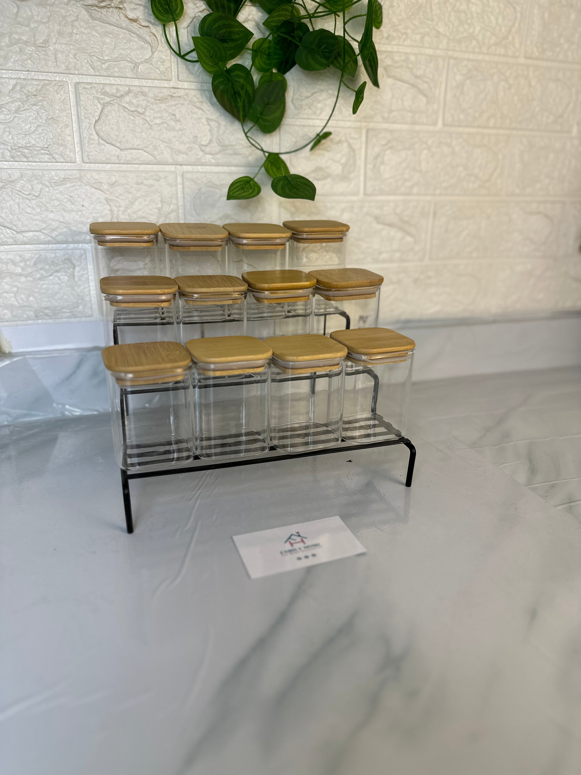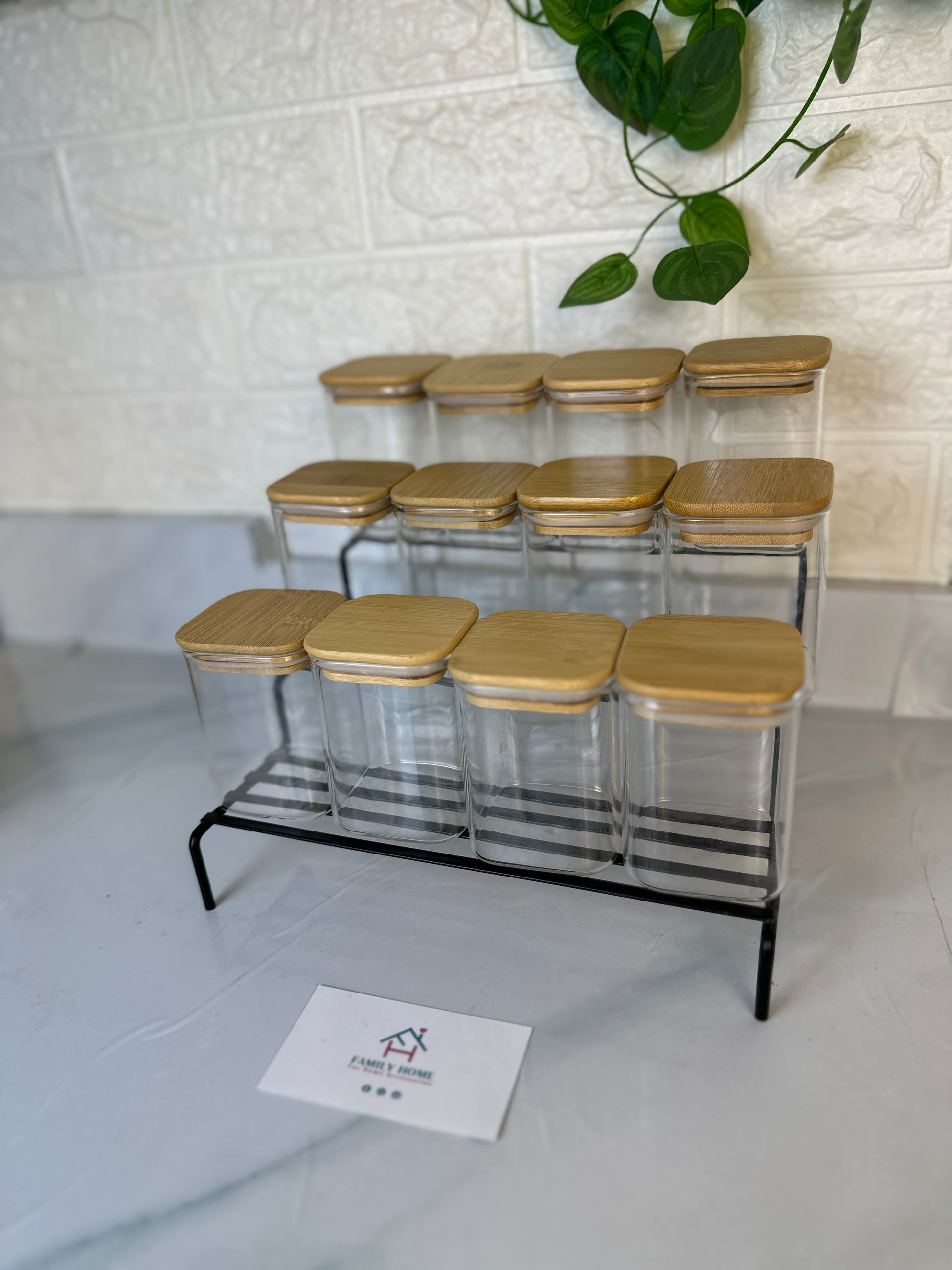 استاند سلم معدن اسود  و طقم 12 برطمان زجاج بغطاء خشب
