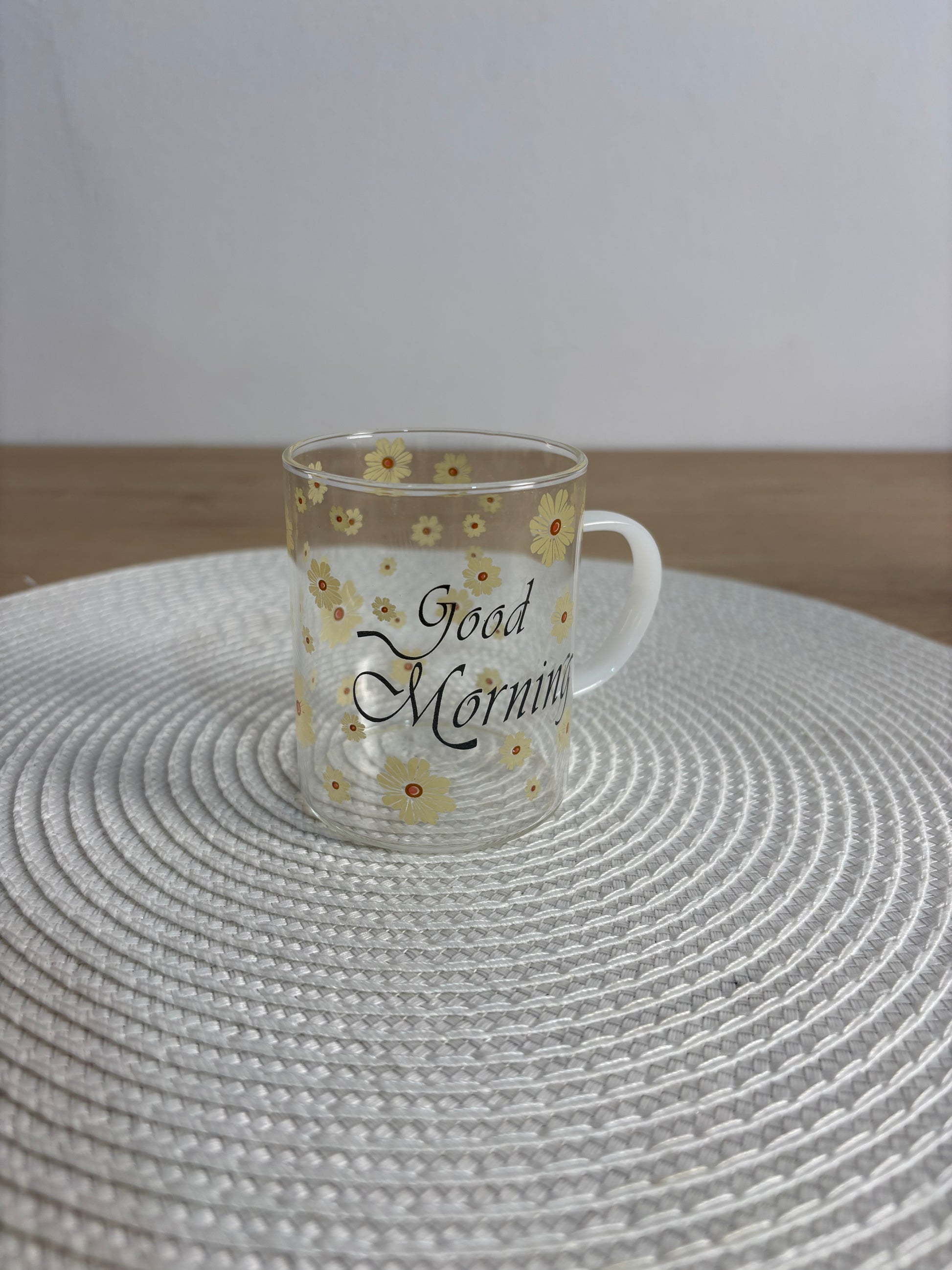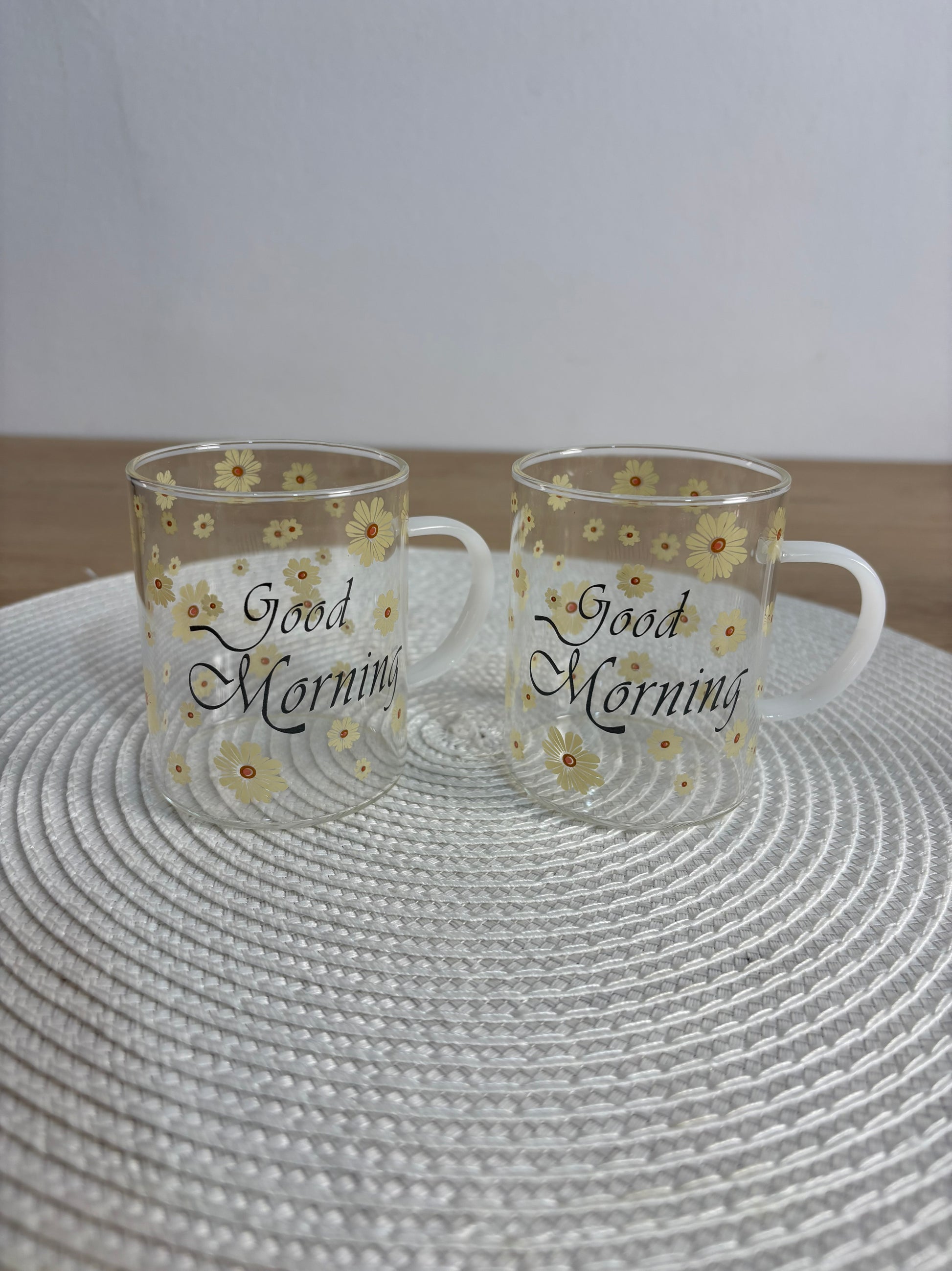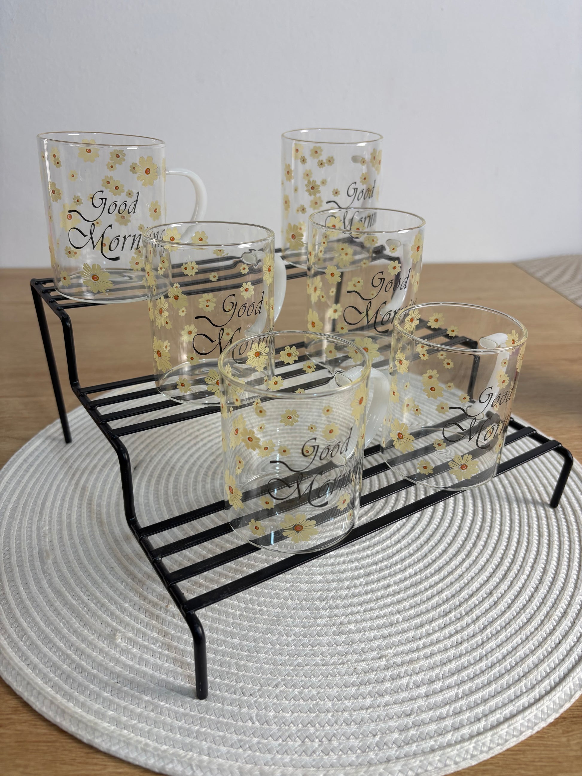 أضف لمسة من البهجة والرقي إلى طاولة الفطور أو السحور مع طقم الأكواب الزجاجية الفريد. تتميز هذه الأكواب بتصميم عصري شفاف مزين بنقوش "دوار الشمس" الصفراء الرقيقة، مع عبارة "Good Morning" لتمنحك بداية يوم مليئة بالطاقة والإيجابية.