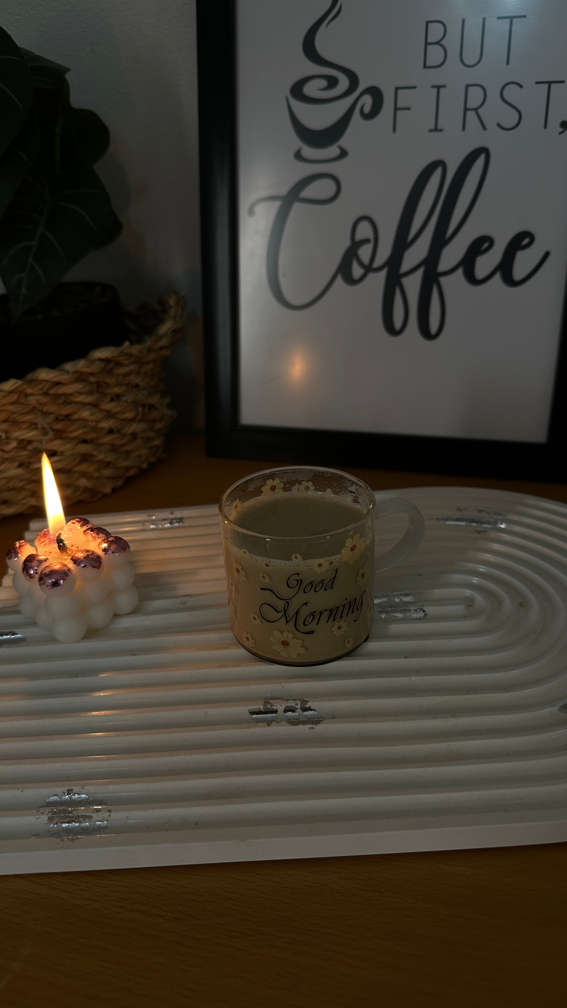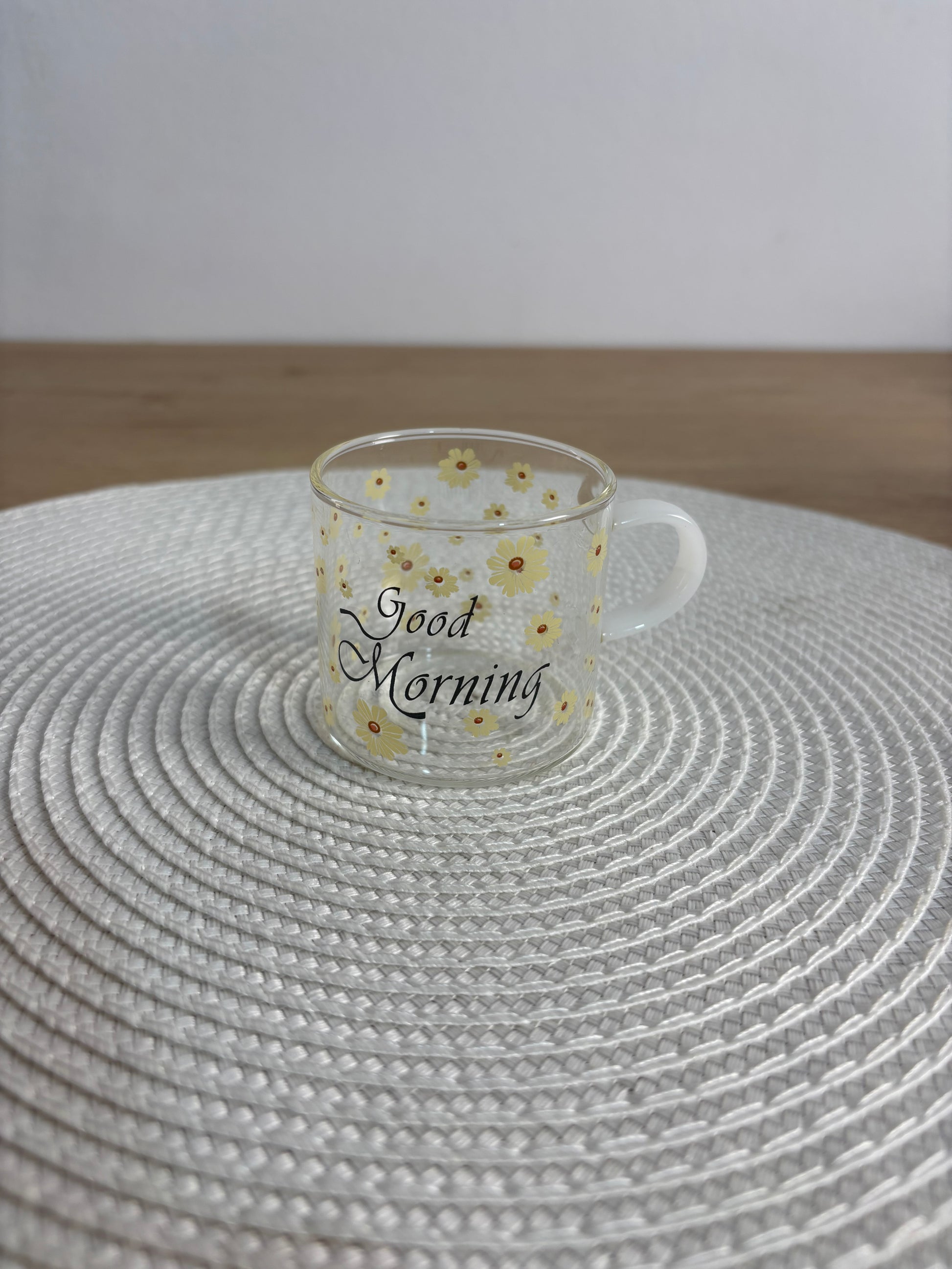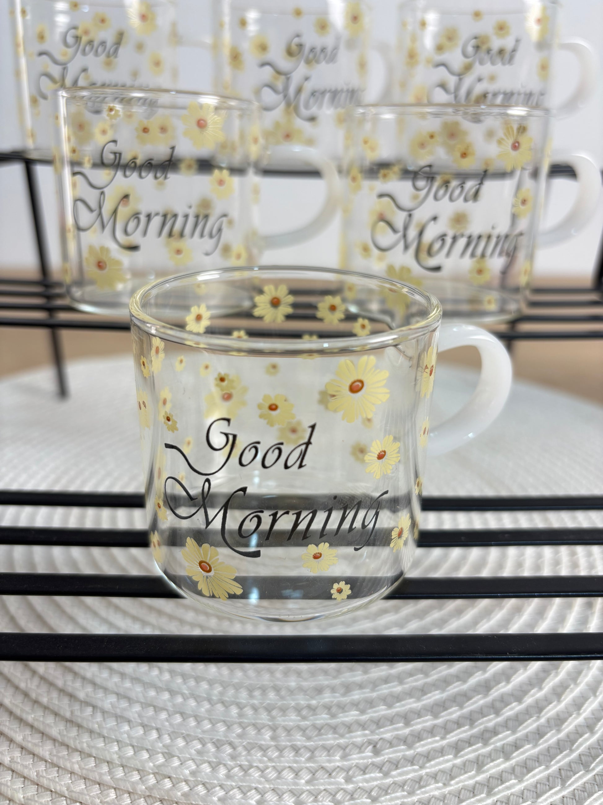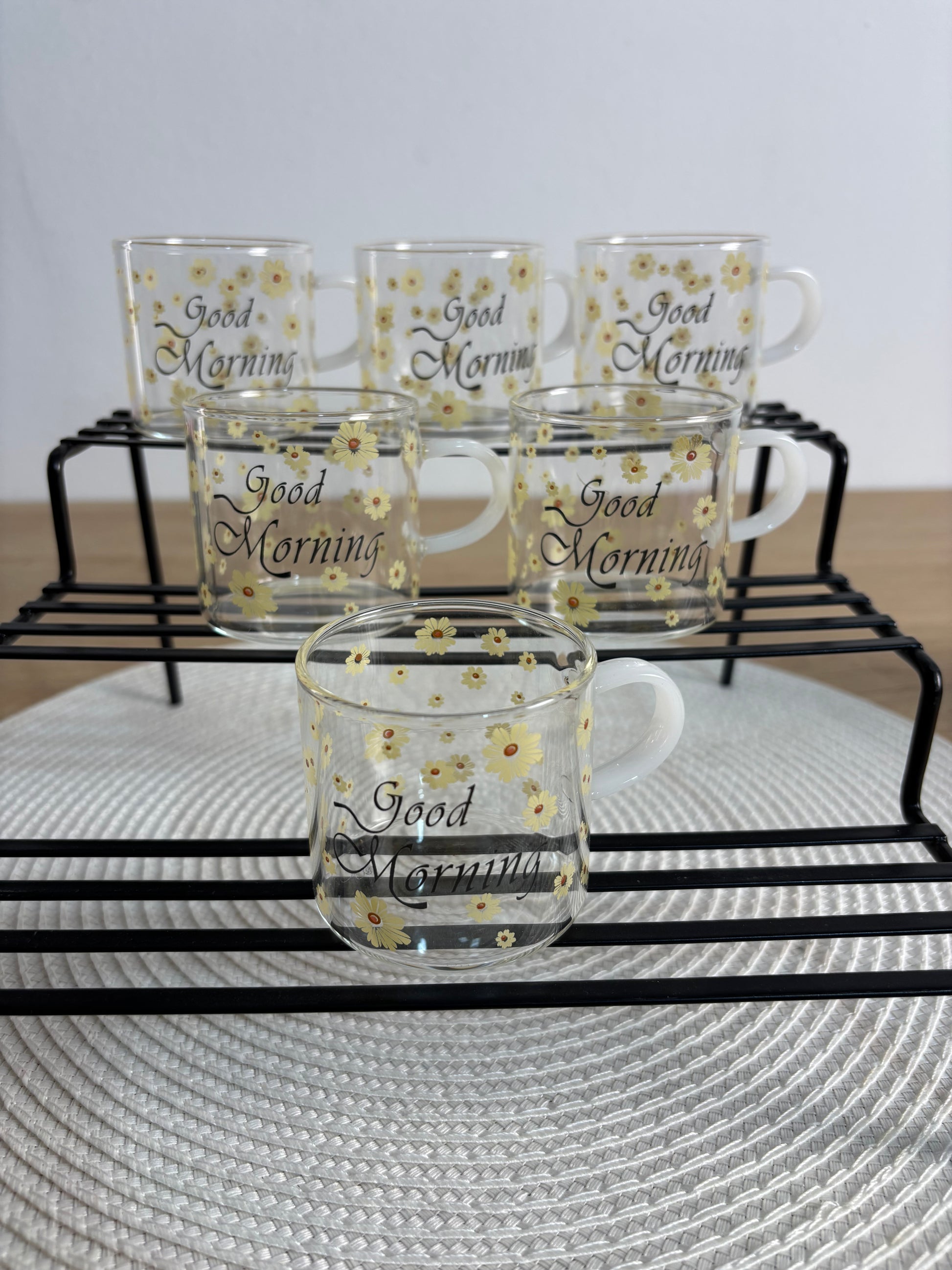 أضف لمسة من البهجة والرقي إلى طاولة الفطور أو السحور مع طقم الفنجان الزجاجية الفريد. تتميز هذه الفناجين بتصميم عصري شفاف مزين بنقوش "دوار الشمس" الصفراء الرقيقة، مع عبارة "Good Morning" لتمنحك بداية يوم مليئة بالطاقة والإيجابية.