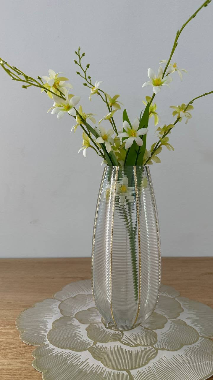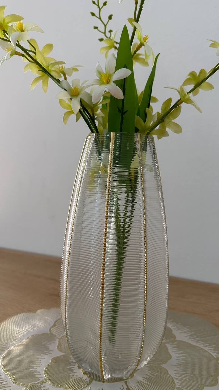 فازة زجاجية أنيقة ذات شكل عمودي انسيابي. تتميز بتصميم فريد على الزجاج يحاكي ريش الطيور أو الأوراق، ومفصولة بـخطوط ذهبية عمودية لامعة. قطعة فنية تضفي الفخامة والرقي.