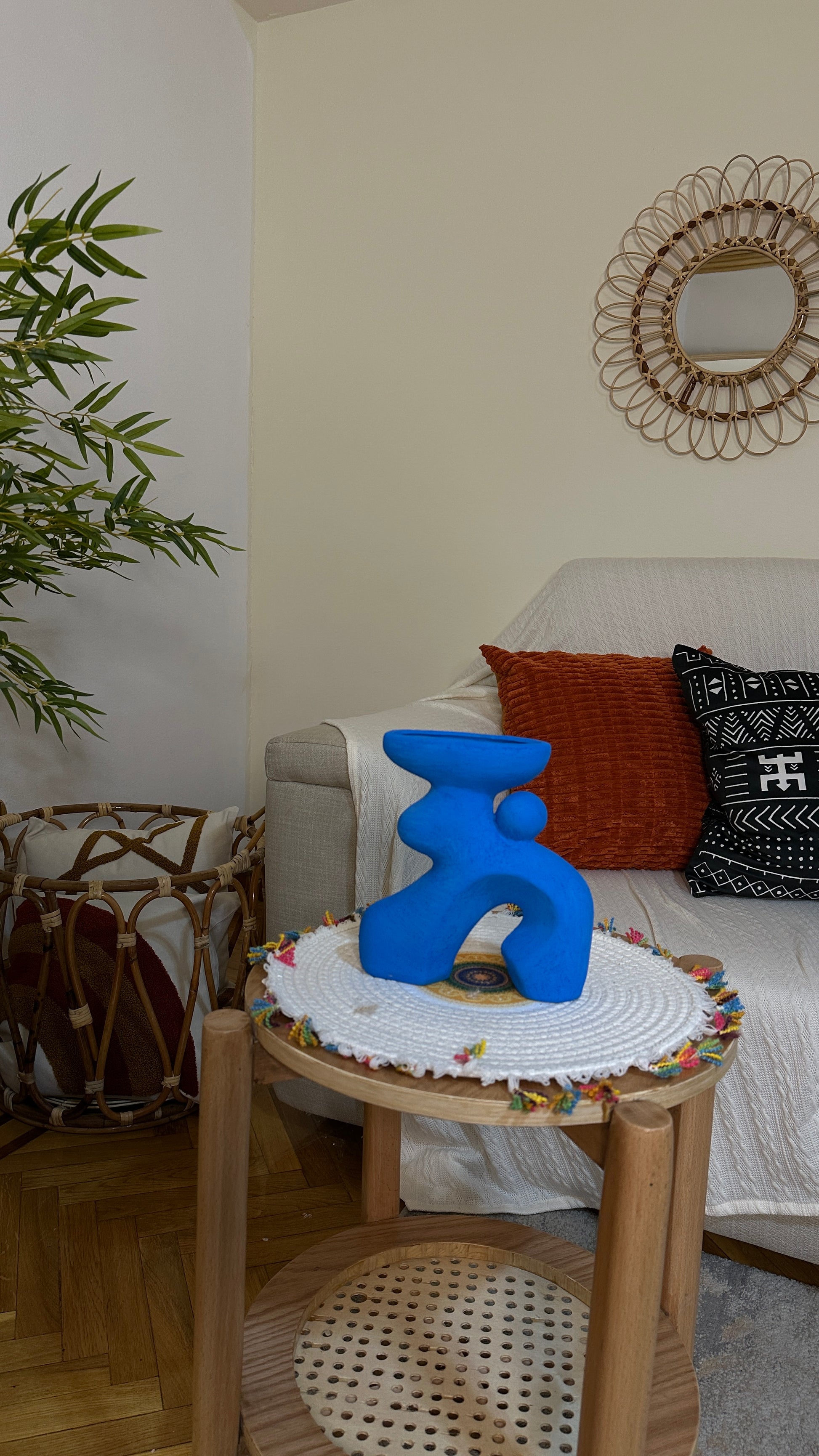 فازة من الفخار تتميز بشكلها الجريء والوانها المختلفة والمميزة والسطح ذو ملمس خشن و المحبب الفم ضيق ومناسب لتنسيق الأعشاب أو الزهور المجففة