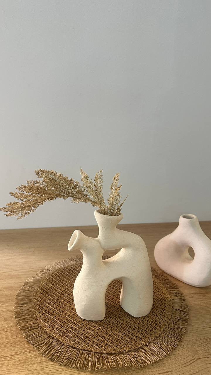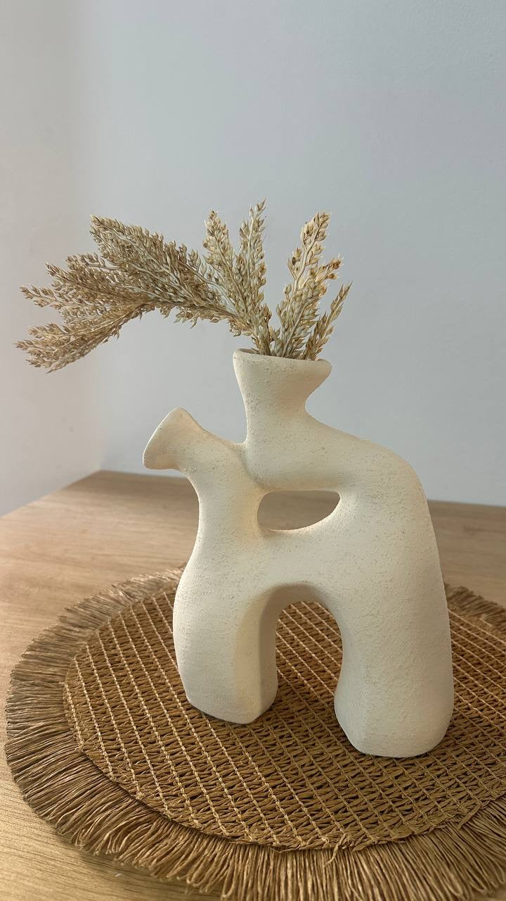فازة فخارية بتصميم عضوي غير منتظم يضم منحنيات انسيابية وفتحات غير تقليدية. السطح ذو ملمس خشن ولون بيج كريمي دافئ.